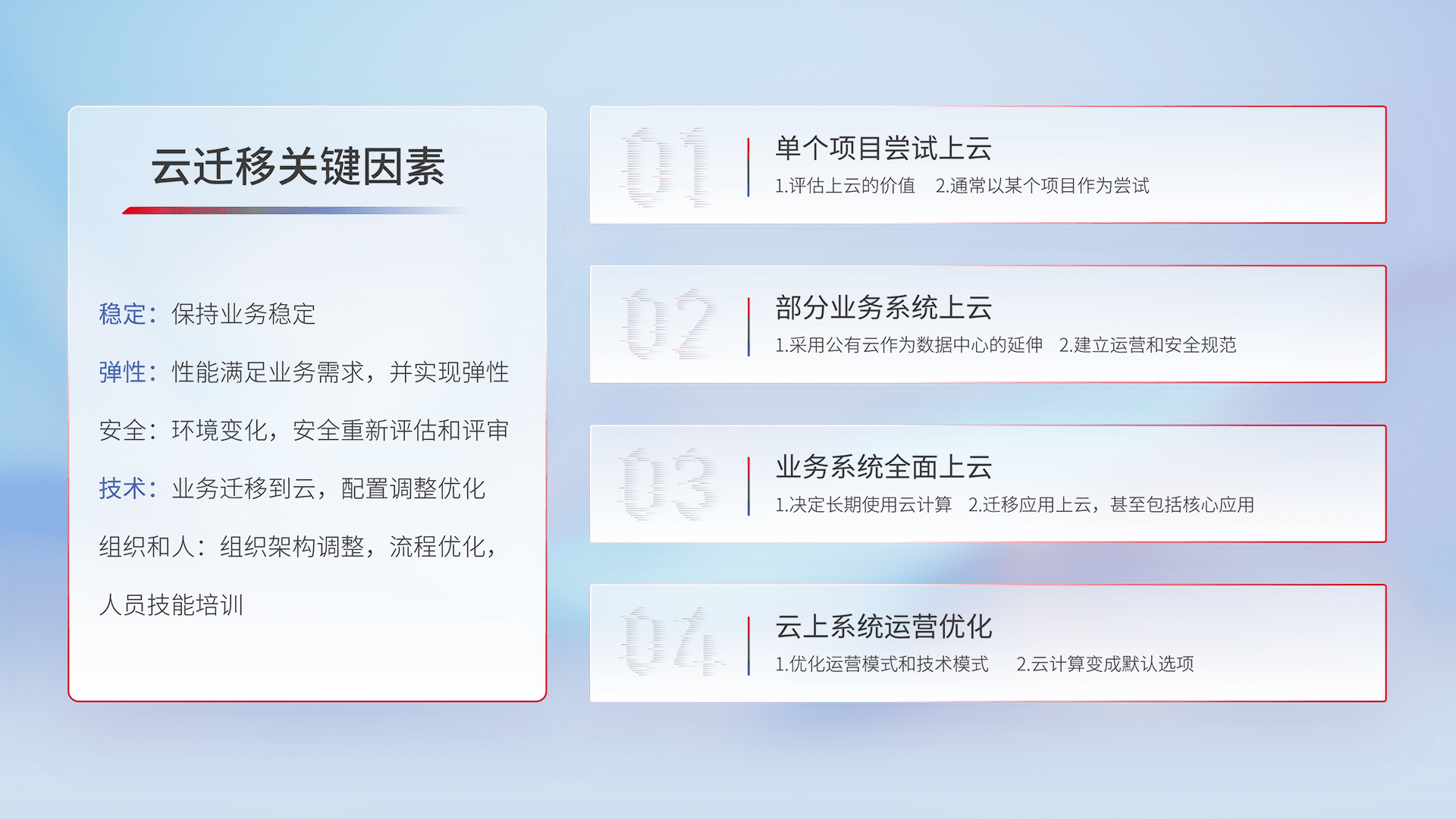 结合实际业务,,从规划设计、、、、云平台选型、、云原生改造、、数据迁移、、集成交付,,,迁移全过程为客户识别最佳上云路径,,,做好风险识别管理,,,,设计网络架构、、身份权限、、、安全审计合规、、、操作审计、、、、日志审计、、、、监控告警策略、、、多站点容灾设计等,,对云上基础设施进行整体规划,,提升IT治理水平,,,以满足弹性、、、高可用、、、高性能的需求。。。