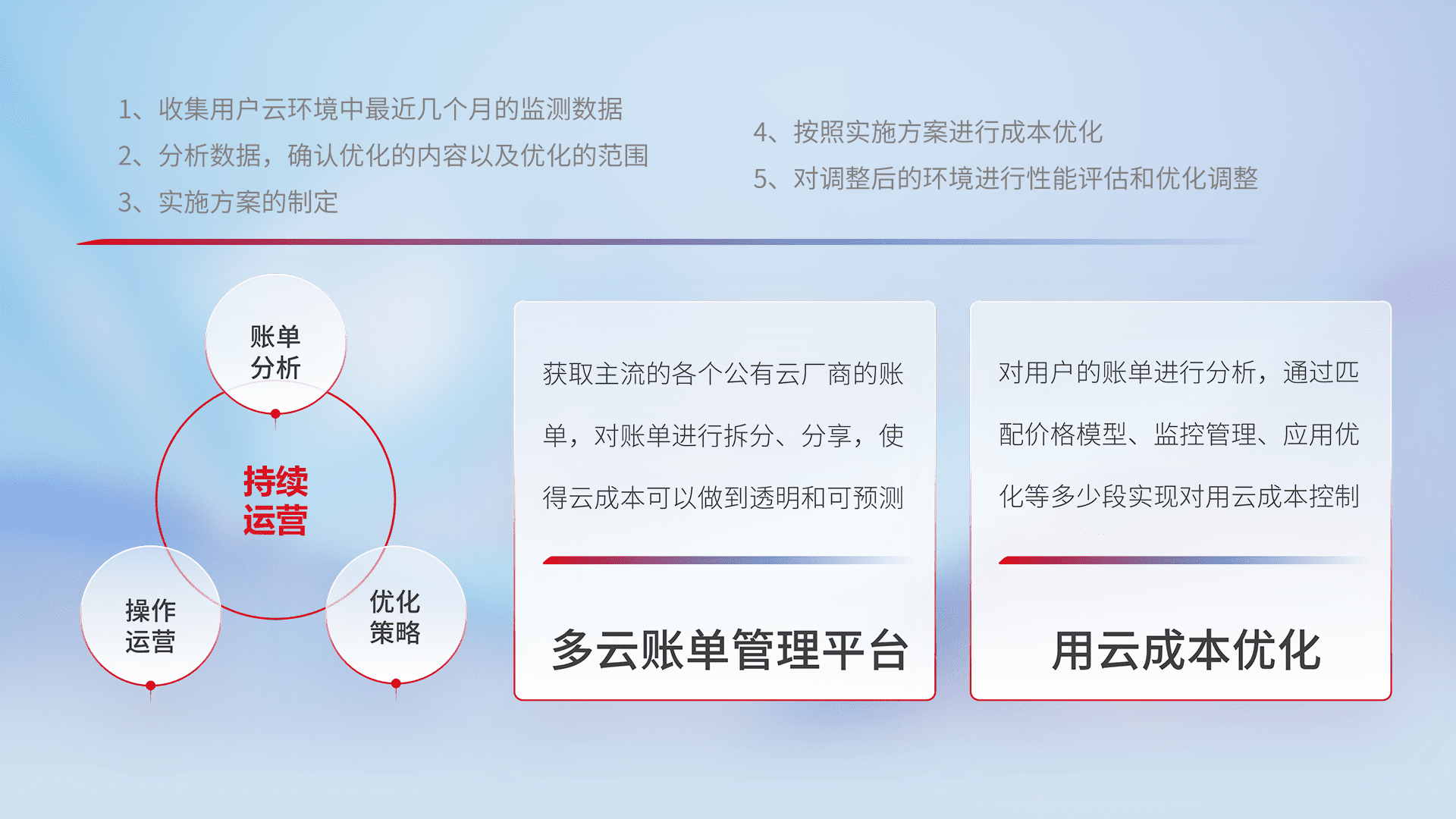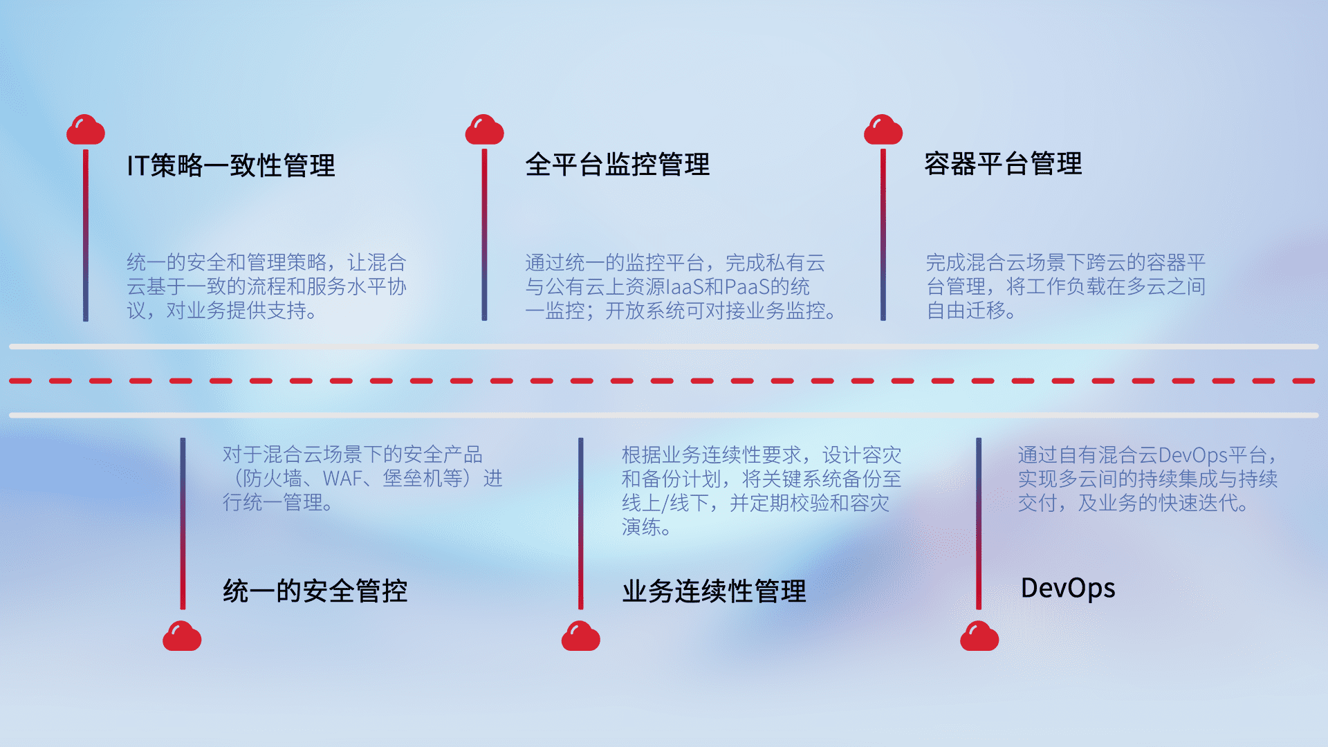 通过多云纳管,,,,以统一的资源数据模型把客户的云资源进行抽象和封装,,,进而实现对多云资源的统一操作,,,,保障云资源管理的可靠性、、稳定性与可用性。。。。量身定制化运维内容,,,配置、、、、开发运维、、补丁管理、、、、备份、、监控、、、认证和访问管理、、、、审计和日常巡检等,,,保障在用云过程中的可靠度,,,稳定度以及高可用率。。。