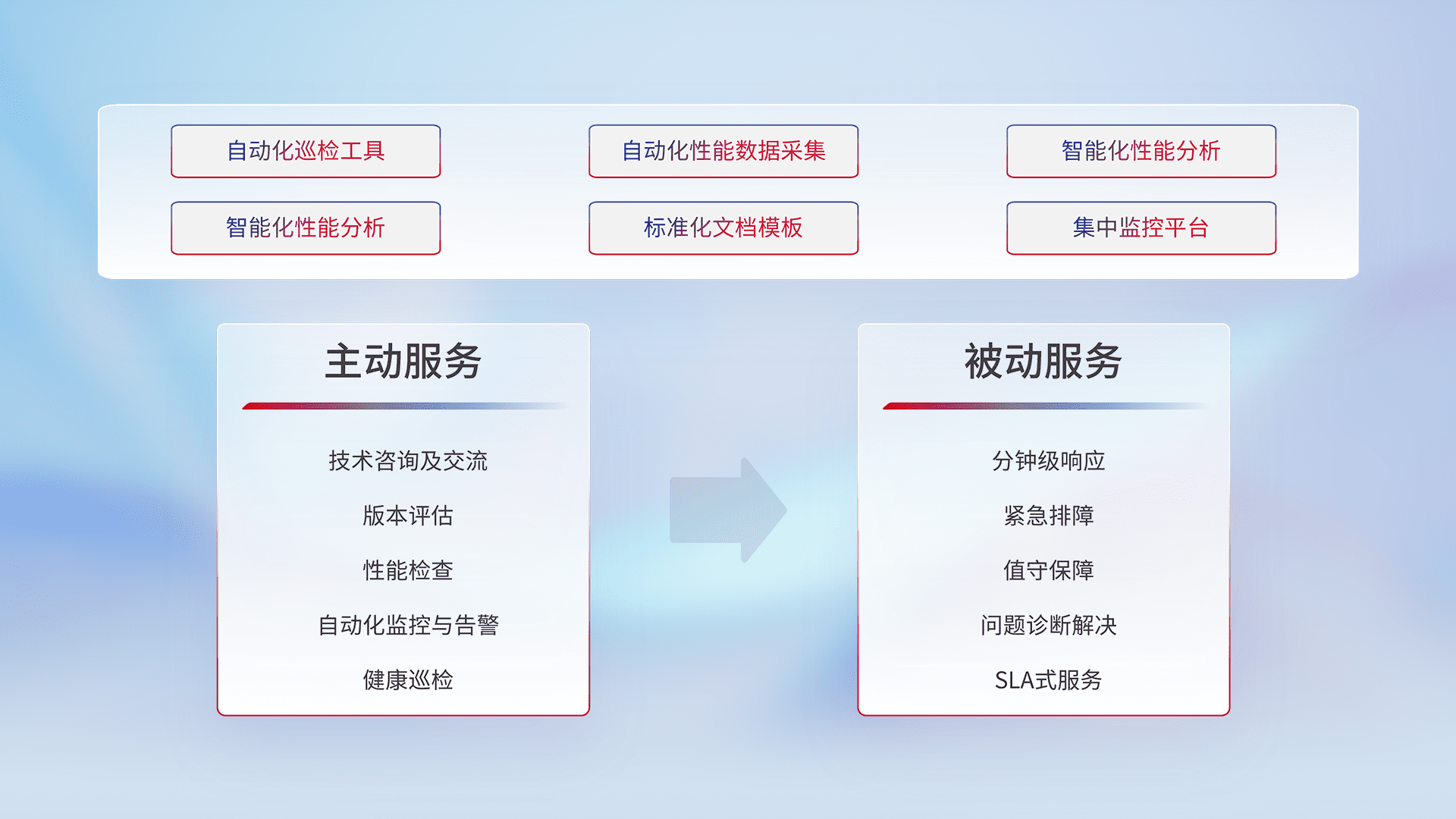智能化工具和标准化文档,,保障服务质量,,,提供主动服务(包含技术咨询、、版本评估、、、性能检查、、自动化监控与告警、、、、健康巡检)和被动服务包含(分钟级响应、、紧急排障、、、值守保障、、、问题诊断解决、、、、SLA服务)。。
